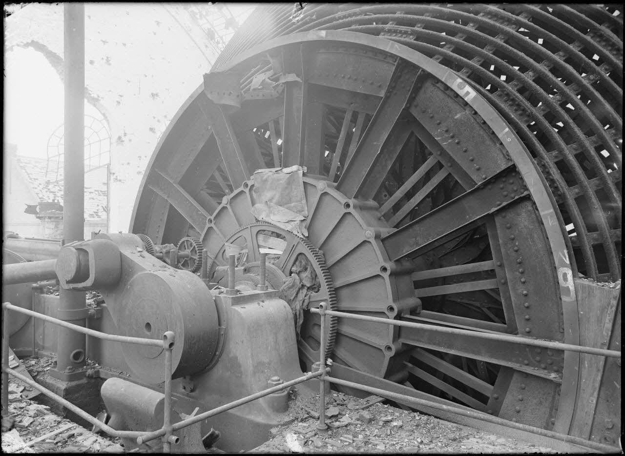Drocourt (Pas-de-Calais). Fosse n°1. Machine d'extraction. Partie non détruite mais où se trouve encore la charge d'explosif déposée par les allemands. [légende d'origine]