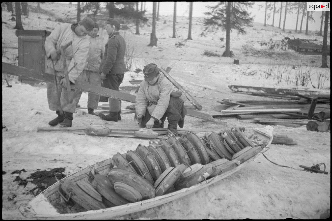 Des fantassins allemands préparent des mines antichars (Tellerminen).