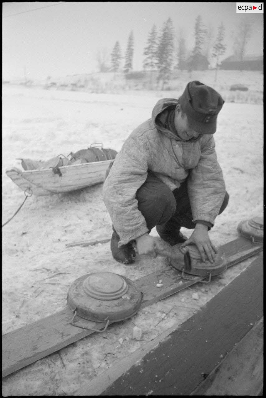 Des fantassins allemands préparent des mines antichars (Tellerminen).