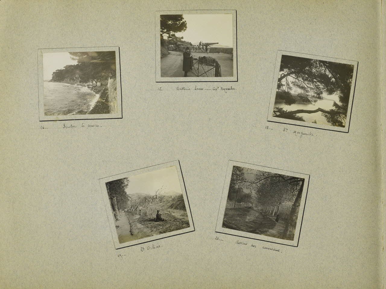 Le sentier de service, l'île de Sainte-Marguerite, Saint-Orliac, la rivière des amoureux et portrait du capitaine Bezombes devant la batterie basse. Notes : les légendes ont été rédigées à partir des éléments textuels d'origine présents dans les albums. Les photographies rassemblées et décrites dans ce reportage sont issues d’un album de photographies intitulé « Madagascar 1 » de format 31,6x24 cm dont les reproductions des pages sont disponibles dans ce reportage.