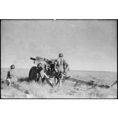 Mise en batterie d'un obusier de 105 mm M2 du 64e RAA (régiment d'artillerie d'Afrique) au cours d'une manoeuvre du CEF (corps expéditionnaire français), avant l'engagement sur le front italien.