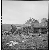 Un artilleur camoufle le canon automoteur M7 Priest "Orléans" de la 1re DB (Division blindée) sous…