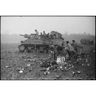 Postés près d'un canon automoteur M8 HMC, des zouaves, servants d'une mitrailleuse Browning 7,62 mm,…