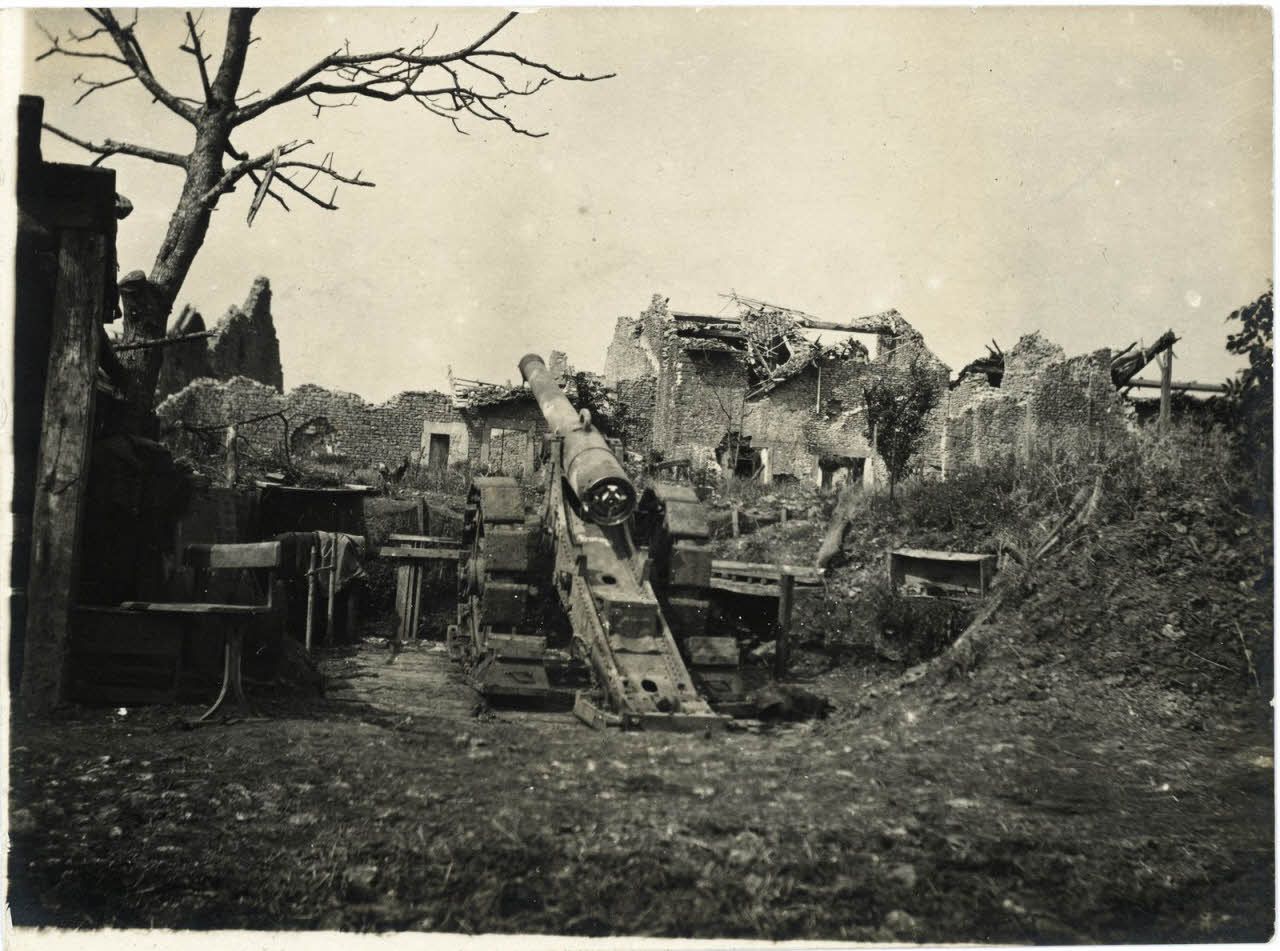 Pièce de 155 long dans le village de Rambucourt. [légende d'origine]