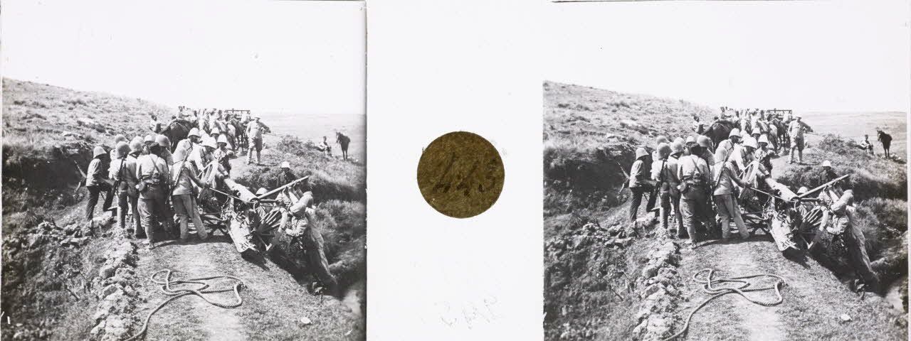 D68-42. Autour de Tananarive, les tirailleurs du 1er régiment de tirailleurs malgaches et les artilleurs de la 3e batterie du 7e régiment d'artillerie exécutent diverses manoeuvres. Ces évolutions sont destinées à apprécier la mobilité des batteries sur le terrain et à s'entraîner au tir. Le relief tourmenté, les cours d'eau et l'absence de routes praticables accentuent la difficulté des déploiements. Les rivières sont traversées à gué ou franchies sur d'étroites pirogues mises bout à bout. Deux types de canons de Bange de calibre de 80 mm sont alors utilisés : les canons de campagne, tirés par des attelages, et les canons de montagne, transportés en pièces détachées par des mulets. Les hommes sont équipés de mousquetons d'artillerie modèle 1892. Arrivés sur le champ de tir, les mulets sont déchargés et les pièces mises en batterie pour effectuer les exercices de tir.
