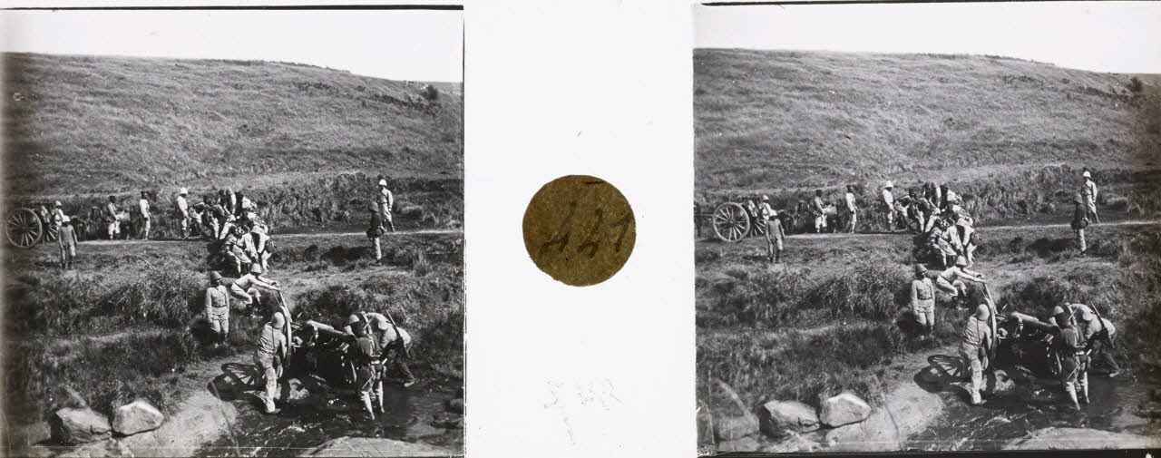 D68-42. Autour de Tananarive, les tirailleurs du 1er régiment de tirailleurs malgaches et les artilleurs de la 3e batterie du 7e régiment d'artillerie exécutent diverses manoeuvres. Ces évolutions sont destinées à apprécier la mobilité des batteries sur le terrain et à s'entraîner au tir. Le relief tourmenté, les cours d'eau et l'absence de routes praticables accentuent la difficulté des déploiements. Les rivières sont traversées à gué ou franchies sur d'étroites pirogues mises bout à bout. Deux types de canons de Bange de calibre de 80 mm sont alors utilisés : les canons de campagne, tirés par des attelages, et les canons de montagne, transportés en pièces détachées par des mulets. Les hommes sont équipés de mousquetons d'artillerie modèle 1892. Arrivés sur le champ de tir, les mulets sont déchargés et les pièces mises en batterie pour effectuer les exercices de tir.