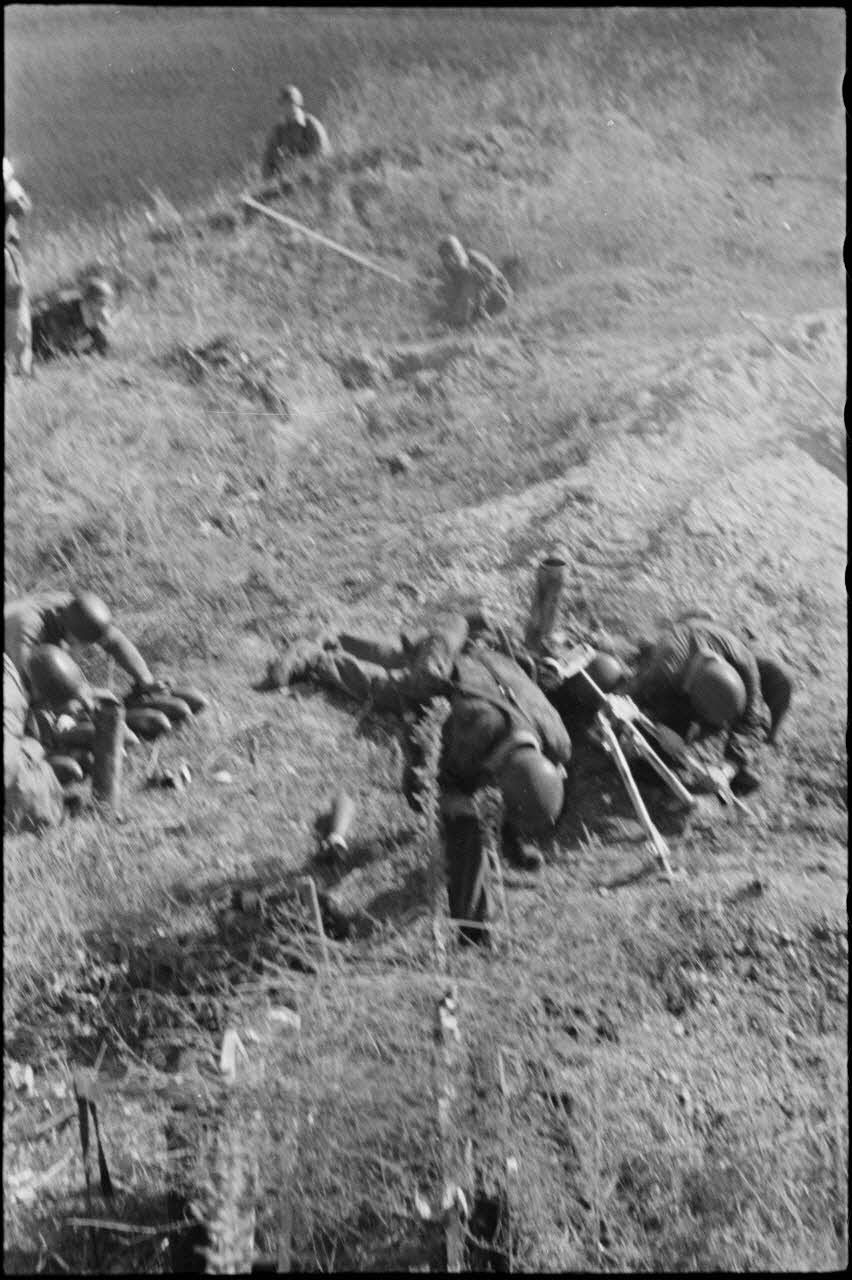 Sur un terrain de manœuvre (peut-être Santa Severa), les troupes italiennes dotées de tenues allemandes reçoivent une instruction de fantassins. Sous la protection de canon automoteur Sturmgeschütz III, les troupes aéroportées progressent sur le terrain. Les hommes sont équipés de pistolets-mitrailleurs MP-40, mitrailleuses MG-42, mortier d'infanterie 8 cm Granatwerfer 34, fusil Mauser 98k. L'unité des Sturmgeschütz III est le Sturmgeschütz-Abteilung 242. On remarque l'insigne de l'unité sur le glacis et ajouts caractéristiques de chenilles sur le flanc de caisse.