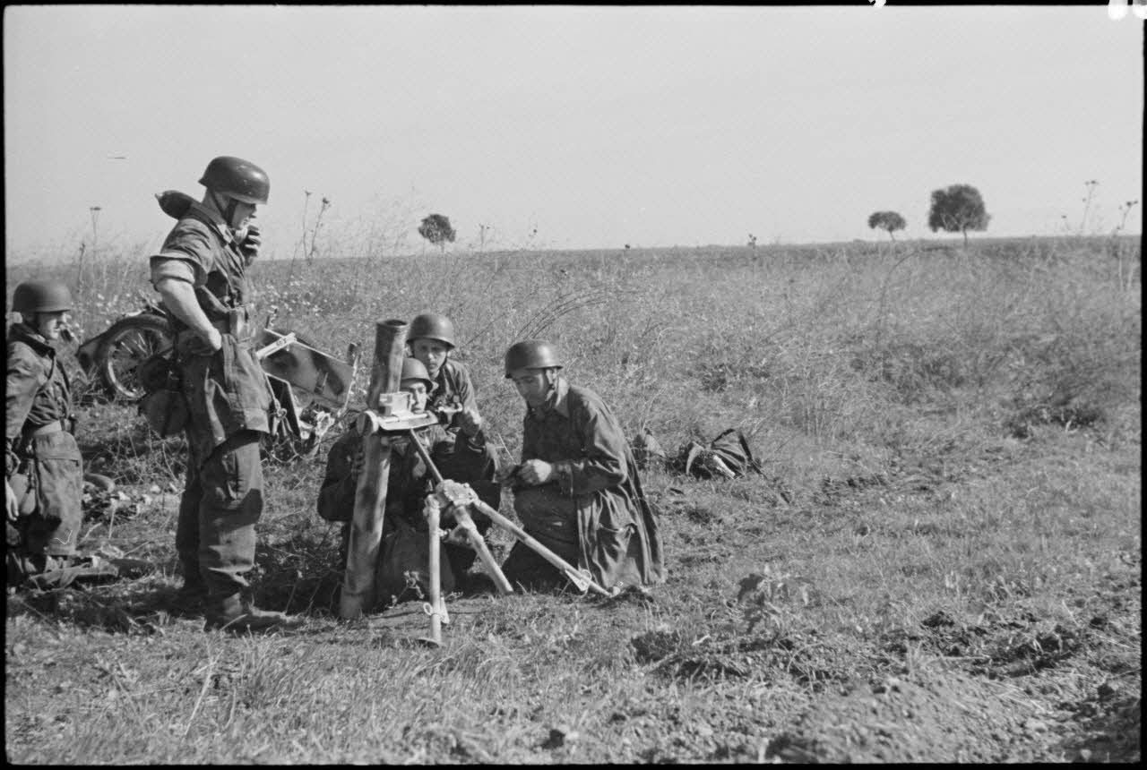 Sur un terrain de manœuvre (peut-être Santa Severa), les troupes italiennes dotées de tenues allemandes reçoivent une instruction de fantassins. Sous la protection de canon automoteur Sturmgeschütz III, les troupes aéroportées progressent sur le terrain. Les hommes sont équipés de pistolets-mitrailleurs MP-40, mitrailleuses MG-42, mortier d'infanterie 8 cm Granatwerfer 34, fusil Mauser 98k. L'unité des Sturmgeschütz III est le Sturmgeschütz-Abteilung 242. On remarque l'insigne de l'unité sur le glacis et ajouts caractéristiques de chenilles sur le flanc de caisse.