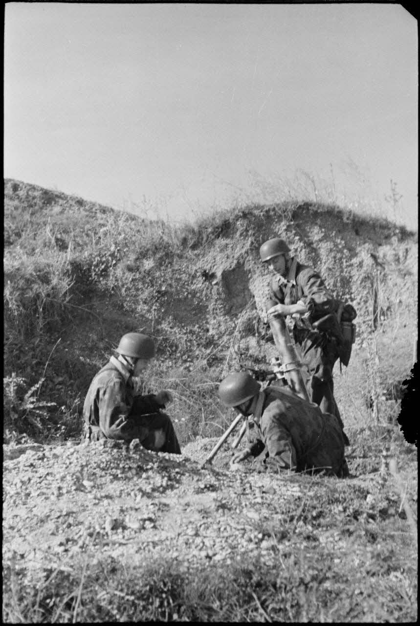 Sur un terrain de manœuvre (peut-être Santa Severa), les troupes italiennes dotées de tenues allemandes reçoivent une instruction de fantassins. Sous la protection de canon automoteur Sturmgeschütz III, les troupes aéroportées progressent sur le terrain. Les hommes sont équipés de pistolets-mitrailleurs MP-40, mitrailleuses MG-42, mortier d'infanterie 8 cm Granatwerfer 34, fusil Mauser 98k. L'unité des Sturmgeschütz III est le Sturmgeschütz-Abteilung 242. On remarque l'insigne de l'unité sur le glacis et ajouts caractéristiques de chenilles sur le flanc de caisse.