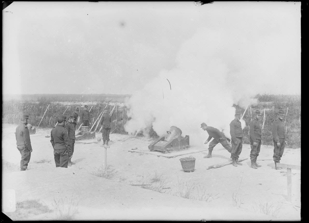 Artillerie - Les manœuvres, exercices en plein air, artilleur monté sur une grande échelle pour relever les positions.