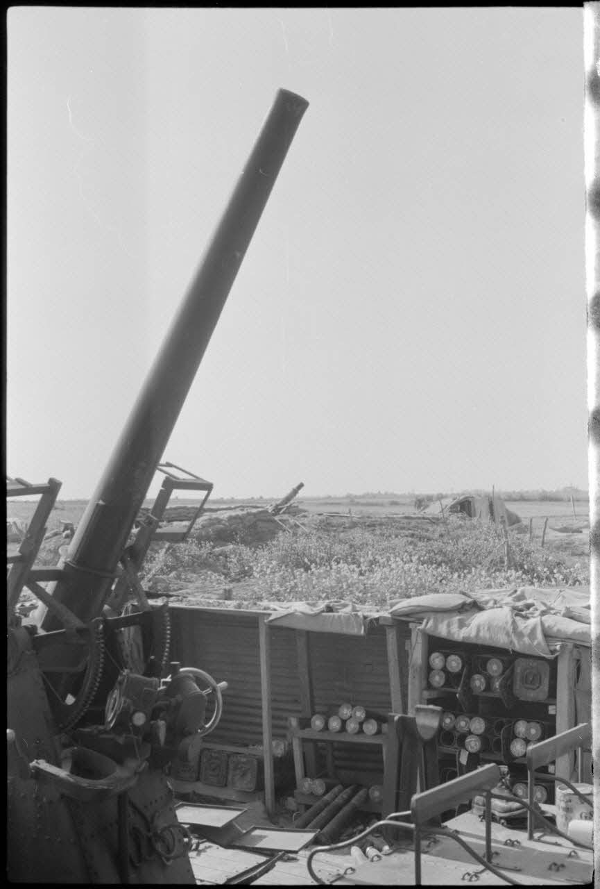 Une position antiaérienne britannique et les encuvements pour canons de 3 Inch 20 cwt AA (12 pounder 20 cwt QF) guidés par un télémètre. La batterie dispose de tranchées défensives et d'un poste de secours (First Aid post, DAA 557 L20).