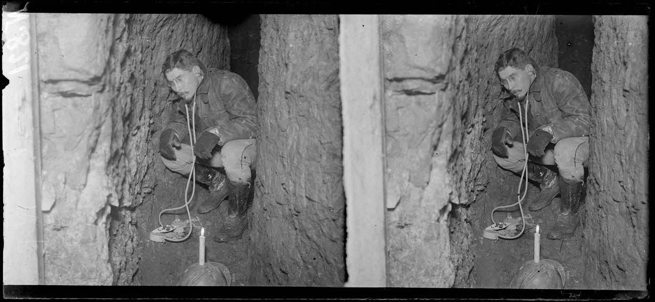 Près de La Harazée. sous-secteur d'Assas. Un officier du génie écoute au stéthoscope les travaux souterrains de l'ennemi. [légende d'origine]