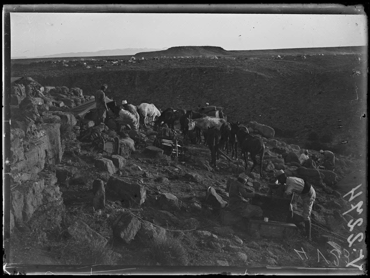 Opérations militaires sur la Haute Moulouya (Maroc). Les mulets de l'intendance à Tafagourt.