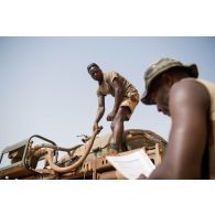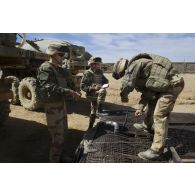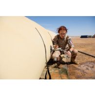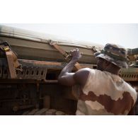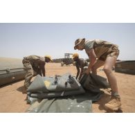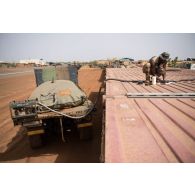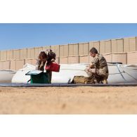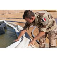 Le caporal-chef Mohamed sangle un bac souple d'eau…