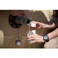 Un soldat remplit une nourrice d'eau. Cette eau a…