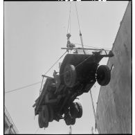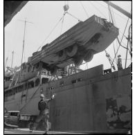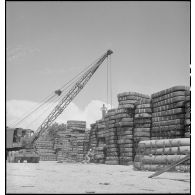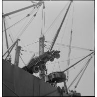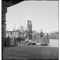 Des marchandises sont déchargées à l'aide d'une grue de l'entreprise Caillard et Cie, Le Havre.
