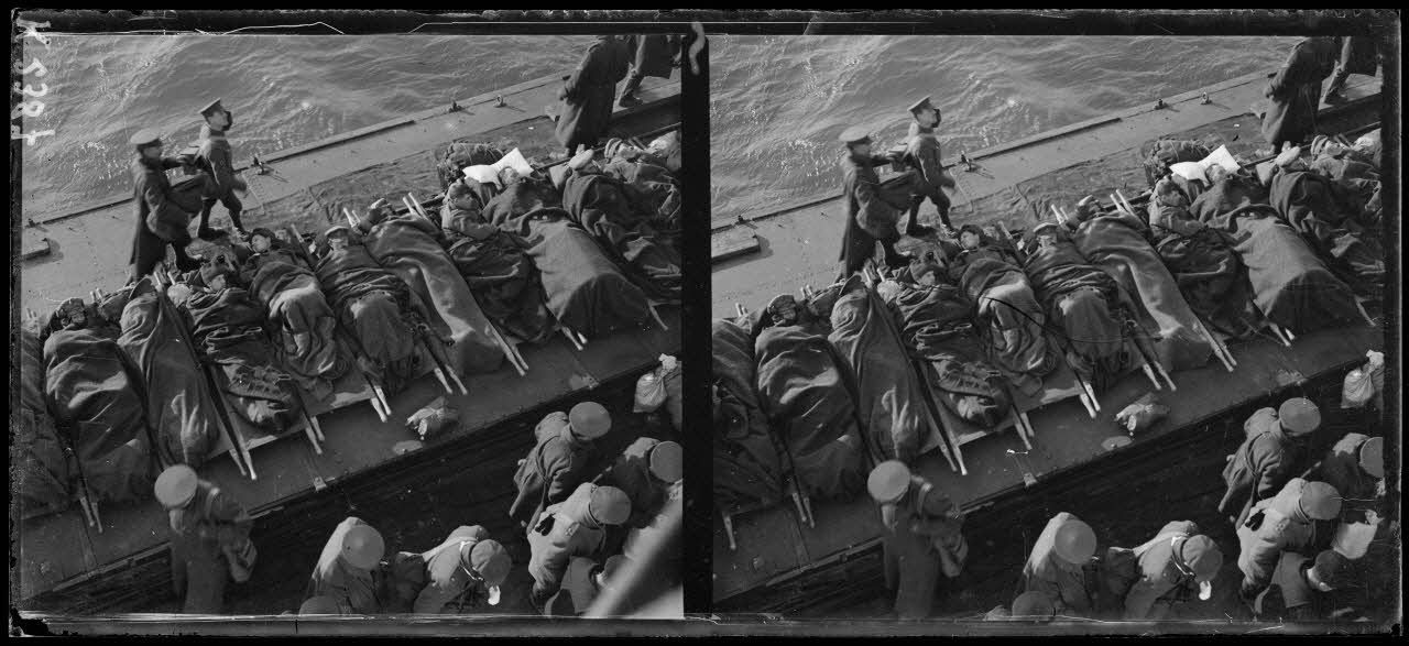 Rade de Salonique. Radeau amenant à bord du Dundle Castle les blessés et malades. [légende d'origine]