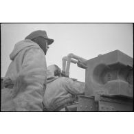Devant des caisses alignées comme une pour en faire une barrière, des soldats de l'armée allemande…