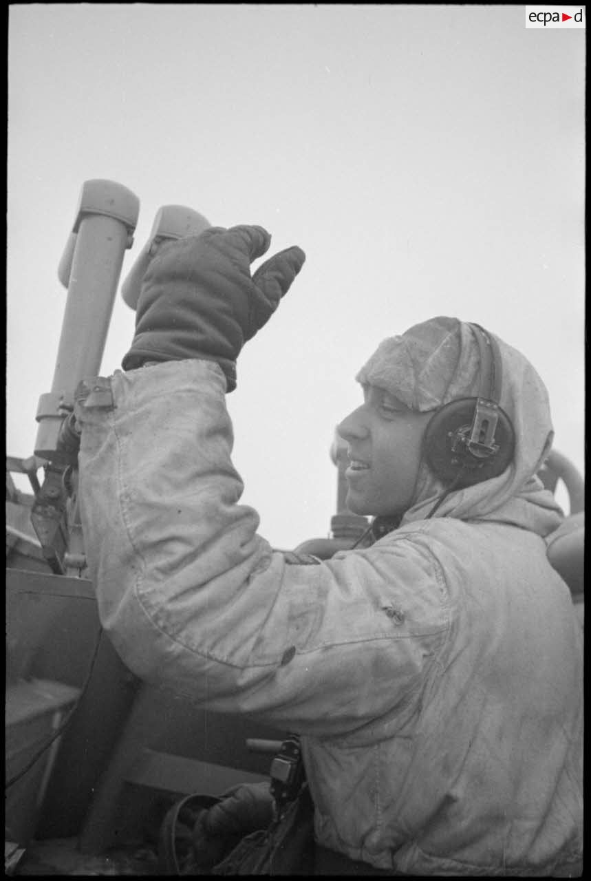 Un artilleur au sein d'un Nashorn (Sd.kfz.164) armé d'un canon de 8,8 cm Pak 41/43 du 3e escadron du schwere Panzerjäger-Abteilung 519.