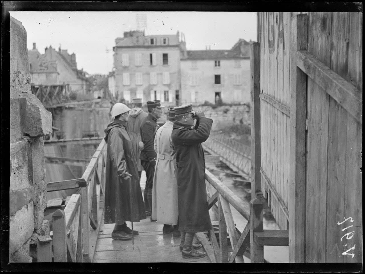 Soissons, le capitaine Saynes regardant les lignes ennemies de la passerelle établie sur l'Aisne, près du pont des Anglais. [légende d'origine]