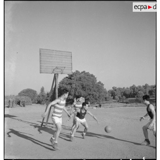Des tirailleurs indochinois disputent un match de basket-ball au camp de Darboussière.
