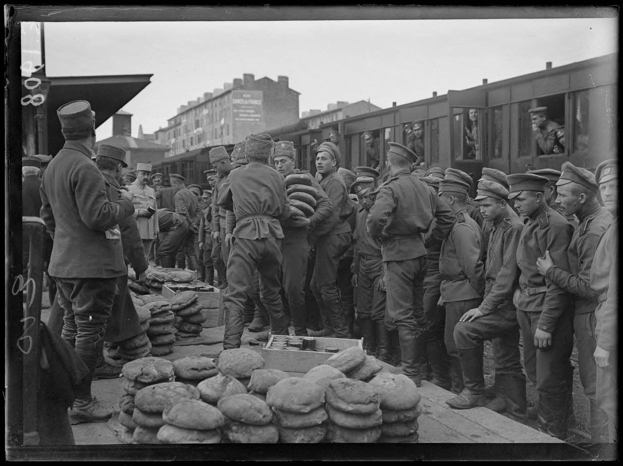 Gare de Toulon. Ravitaillement des troupes russes. Les soldats russes pendant l'arrêt du train.