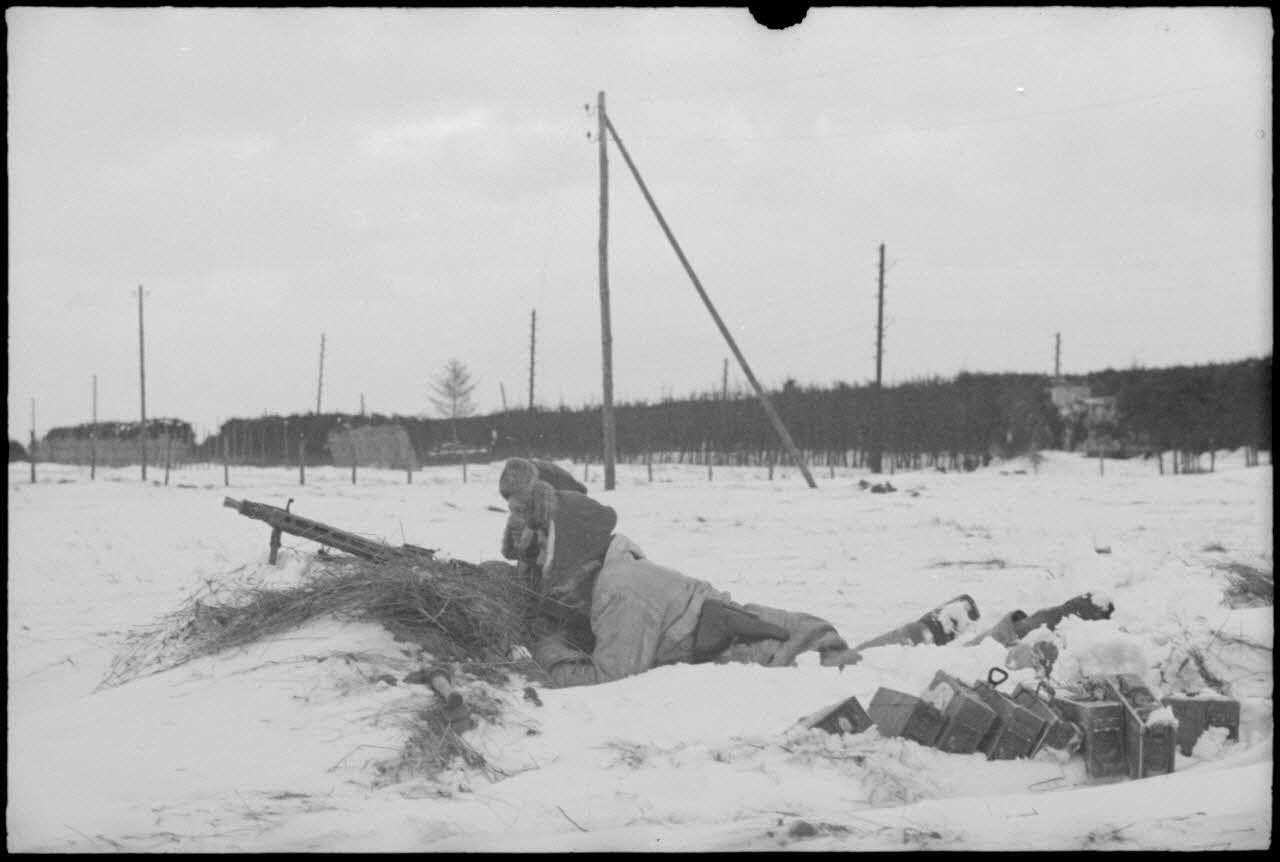 Observation aux jumelles depuis une isba qui abrite les fantassins allemands en charge du contrôle des voies ferrées.