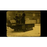 Quatre soldats du 506e RCC posent devant un engin de levage à chenilles Schneider, l'ombre du…