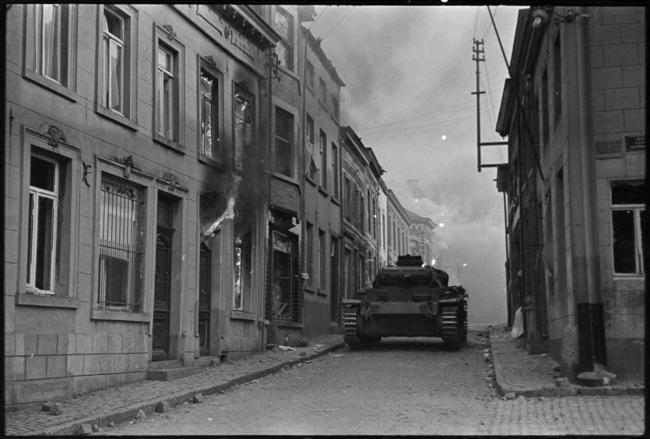 Après la prise de Perwez en Brabant (Belgique), le reporter Eric Borchert immortalise un blindé de la 4e division blindée (4.Panzer-Division).