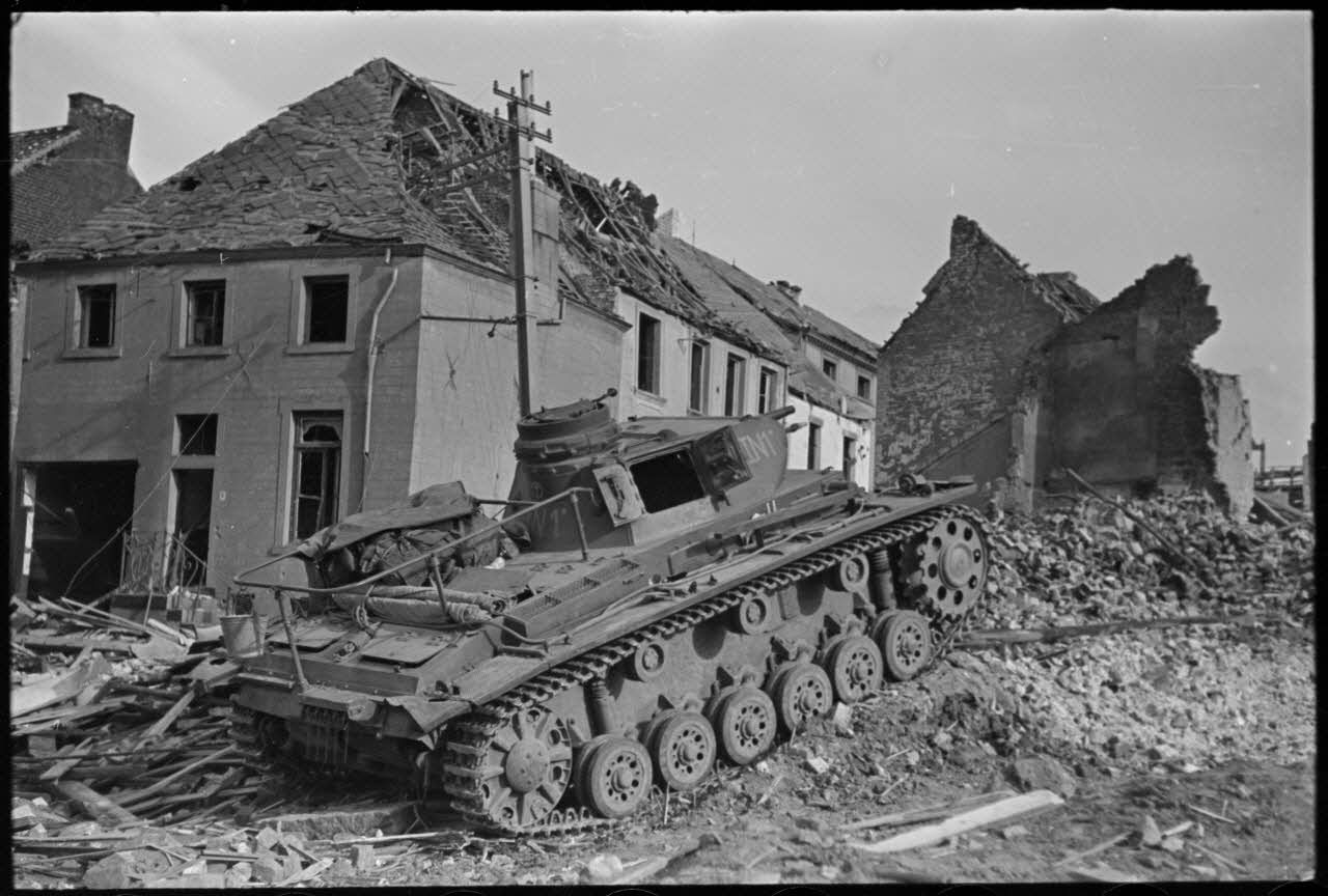 Après la prise de Perwez en Brabant (Belgique), le reporter Eric Borchert immortalise un blindé de la 4e division blindée (4.Panzer-Division).