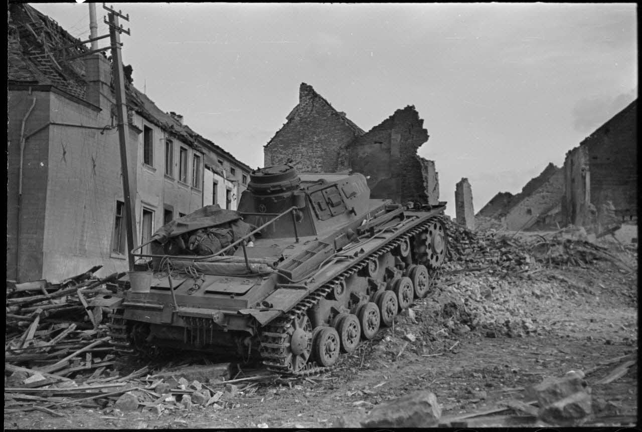 Après la prise de Perwez en Brabant (Belgique), le reporter Eric Borchert immortalise un blindé de la 4e division blindée (4.Panzer-Division).
