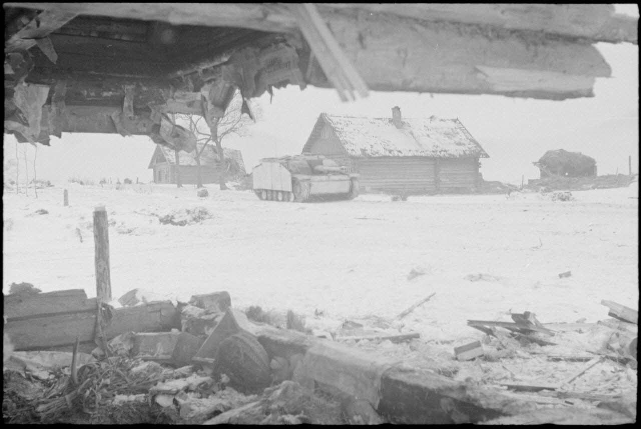 Durant la bataille de Witebsk, camouflé derrière une isba, un canon d'assaut Sturmgeschütz.