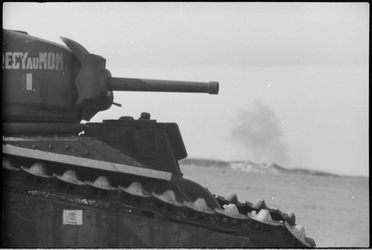 Le blindé B1 bis "Crécy-au-Mont" est parvenu jusqu'au cœur des positions allemandes du Mont-Caubert. Détruit à proximité d'un canon de 8,8 cm FlaK, il suscite l'intérêt du reporter et de l'équipe de tournage qui se rapproche du char.
