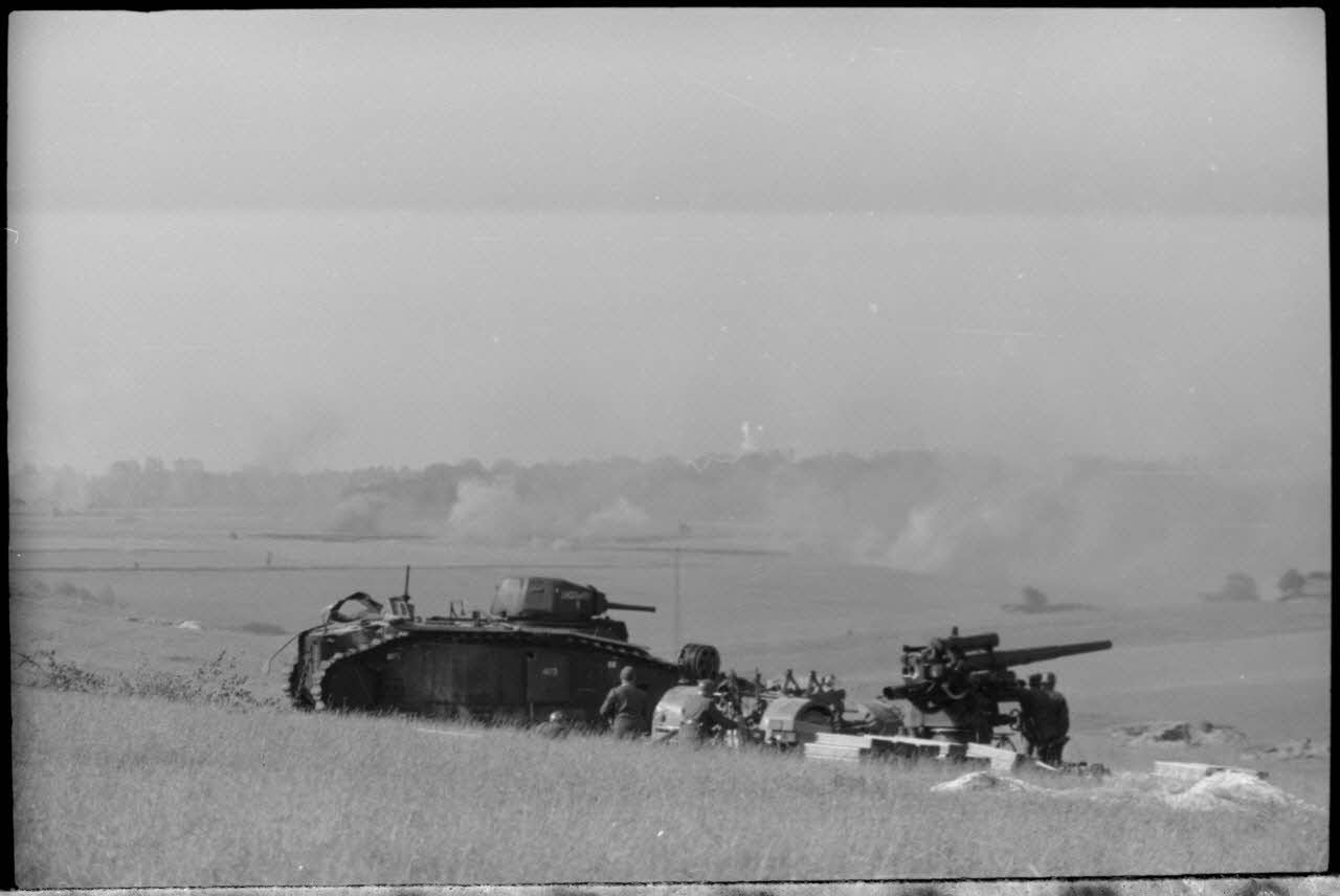 Le blindé B1 bis "Crécy-au-Mont" est parvenu jusqu'au cœur des positions allemandes du Mont-Caubert. Détruit à proximité d'un canon de 8,8 cm FlaK, il suscite l'intérêt du reporter et de l'équipe de tournage qui se rapproche du char.