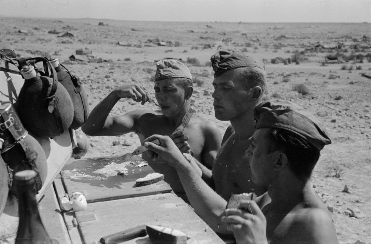 Note : Légende d'origine de l'image DAK 25 L16 publiée dans le "BIZ" (Berliner Illustrierte Zeitung) numéro 38 du 18/09/1941 : "Afrikas Sonne brät Spiegeleier. Nach einem Rezept aus dem Kochbuch des Afrikakorps: Man nehme ein paar Eier, Fett, Salz und ... einen Panzer, auf dessen heißgewordenen Platten sich Mittags in der Wüste herrliche Spiegeleier braten lassen." date de publication : 11/10/1941.
