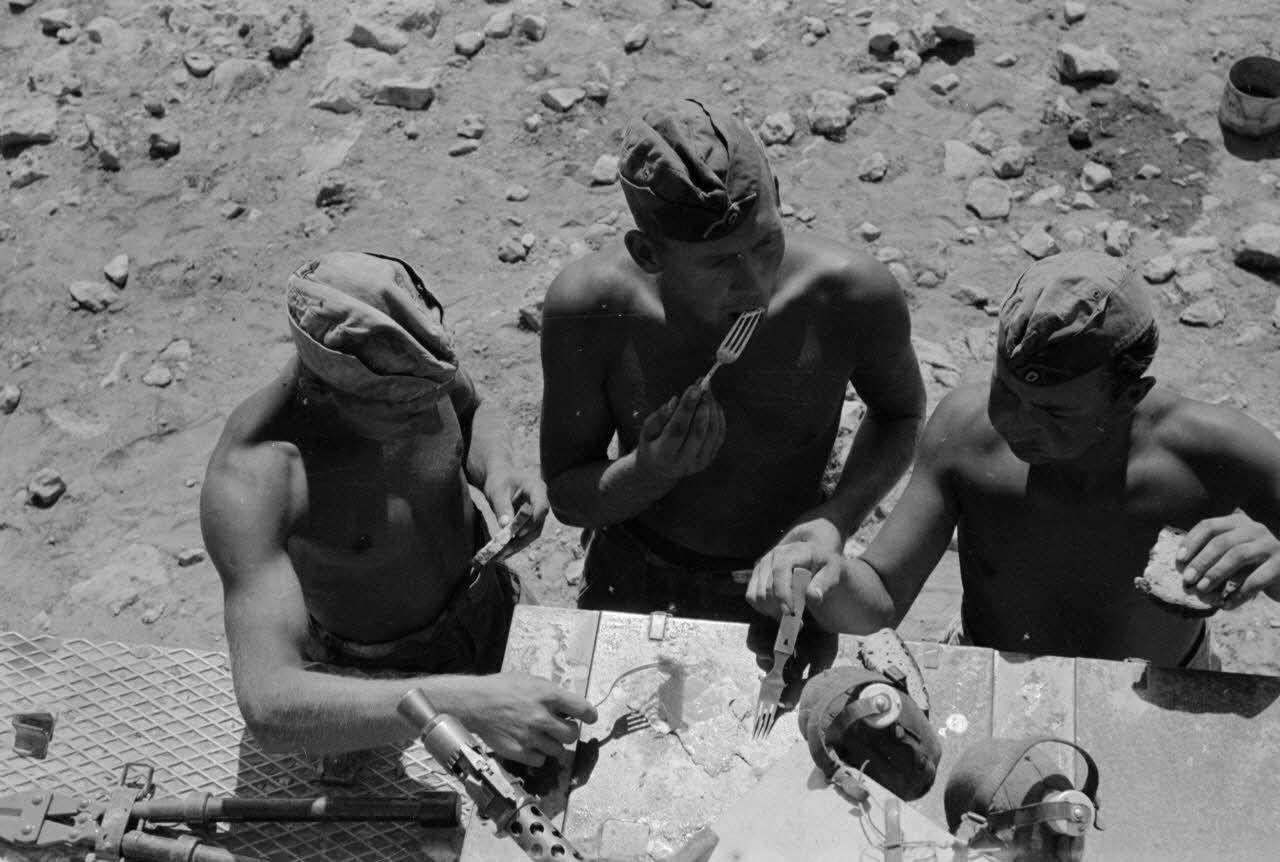 Repas d'un équipage de Panzer-II dans le désert.