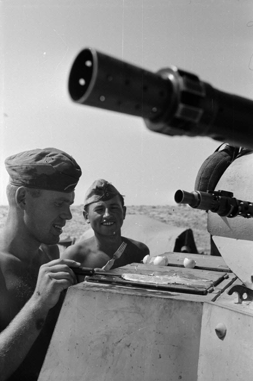 Note : Légende d'origine de l'image DAK 25 L16 publiée dans le "BIZ" (Berliner Illustrierte Zeitung) numéro 38 du 18/09/1941 : "Afrikas Sonne brät Spiegeleier. Nach einem Rezept aus dem Kochbuch des Afrikakorps: Man nehme ein paar Eier, Fett, Salz und ... einen Panzer, auf dessen heißgewordenen Platten sich Mittags in der Wüste herrliche Spiegeleier braten lassen." date de publication : 11/10/1941.
