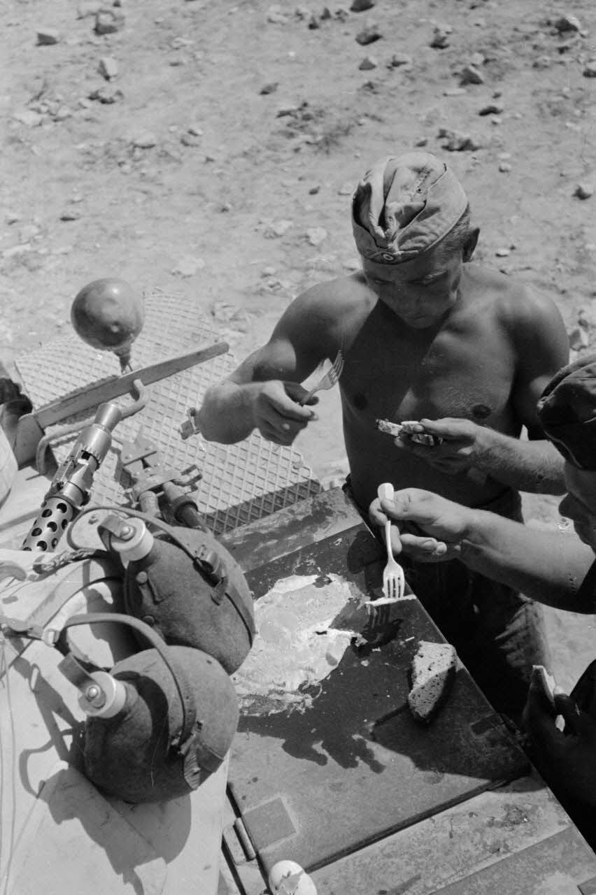Le repas d'un équipage de Panzer II allemands dans le désert. Le char Panzer II forme la majeure partie des effectifs des régiments de chars de l'Afrikakorps en 1941. C'est un blindé léger armé d'un canon de 2 cm et d'une mitrailleuse MG-34.