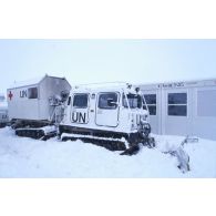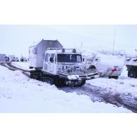 Une chenillette BV-206 tracte un shelter sanitaire.