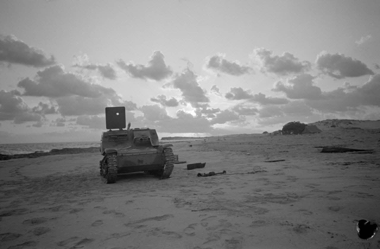 Une chenillette L3/35 ou Carro Veloce CV-35 abandonnée sur une plage.