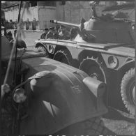 Automitrailleuses de la 2e Compagnie Automobile Saharienne de Transport (CAST) devant un bâtiment.