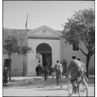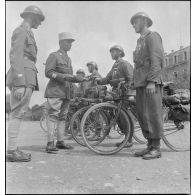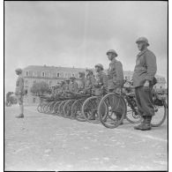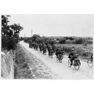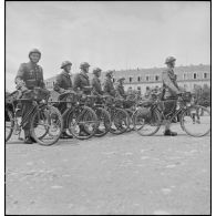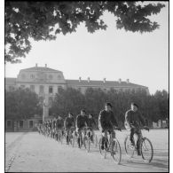 Une brigade à bicyclette d'élèves-officiers quitte la caserne Chabran pour un exercice.