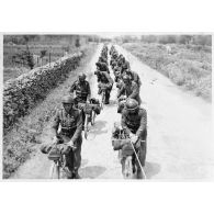 Un peloton cycliste du 12e RC (régiment de cuirassiers) à l'exercice est tracté par un véhicule.