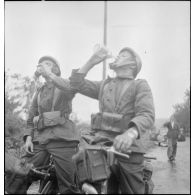 Deux concurrents d'une équipe se désaltèrent au cours de l'épreuve.