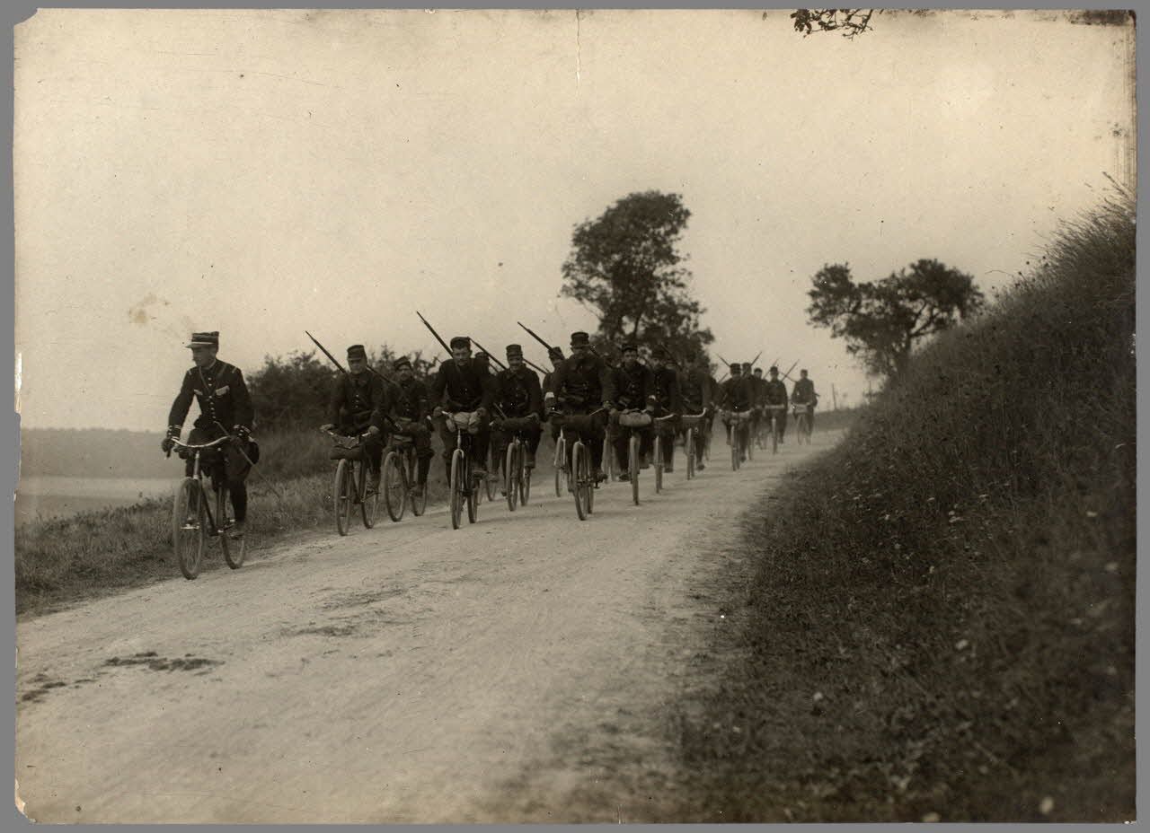 Chasseur - Un groupe du bataillon de chasseurs cyclistes circulent sur un chemin de campagne. [recadrage] [légende d'origine]