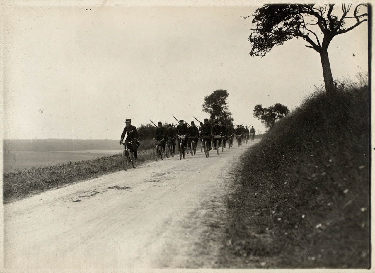 Chasseur - Un groupe du bataillon de chasseurs cyclistes circulent sur un chemin de campagne. [légende d'origine]