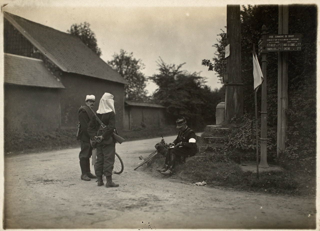 Infanterie - Trois soldats au pied du calvaire sur la route de la commune de Briot dans l'Oise. [légende d'origine]