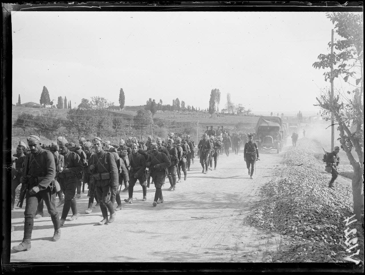 En route pour le front, les troupes grecques, soldats, muletiers et mitrailleurs, s'arrêtent à leur première halte sur la route de Monastir.