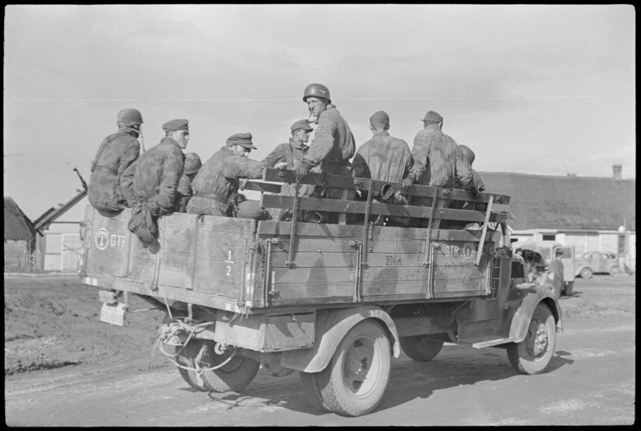 Un camion ouvert transporte des parachutistes allemands (Fallschirmjäger).