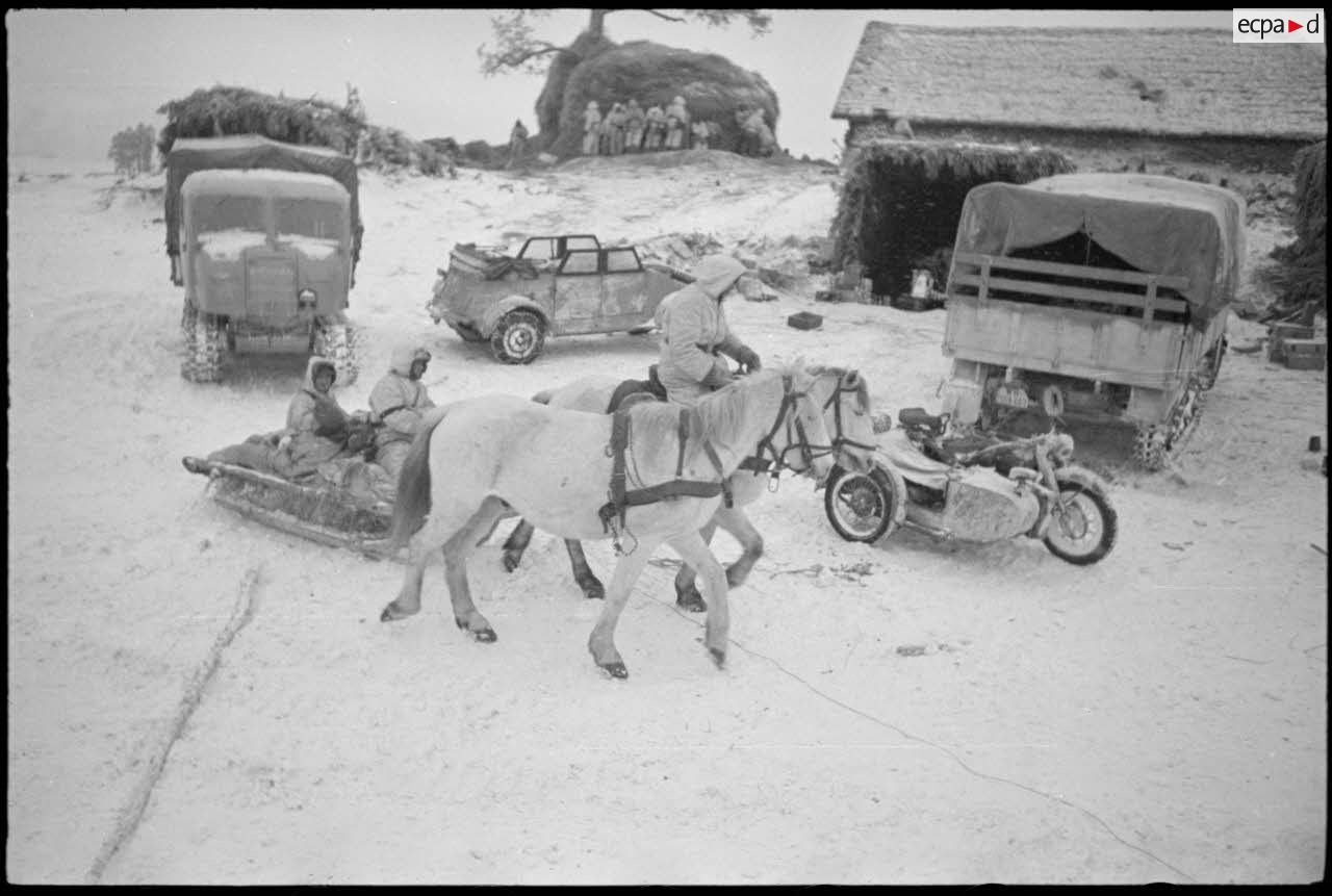 Un Nashorn (Sd.kfz.164) progresse sur une route enneigée. Un Sd.kfz.124 "Wespe" embourbé, a été abandonné par son équipage. Le passage d'un petit pont de bois demande le soutien de fantassins allemands, les camions l'empruntent également avec prudence. Des fantassins allemands progressent lentement sous la couverture des tirs des Nashorn baptisés "Ostpreussen" et "Goliath" (?). Le reporter est monté à bord d'un des canons automoteurs et immortalise les compartiments pour les obus de 8,8 cm pour le canon Pak 41/43 et quelques tirs. Après quelques salves, deux équipages se rassemblent pour fumer. Portraits de fantassins.